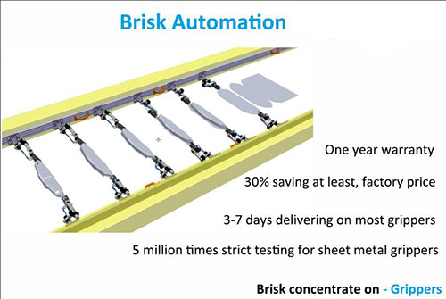 High-performance electric stamping gripper for transfer press tooling is run on transfer die for auto parts and have the ability to pick up, place, hold and release objects while an action is being executed. Long life cycle, best price and flexible industrial assembly make Brisk grippers the best one available. Stamping gripper could save assembly hours.